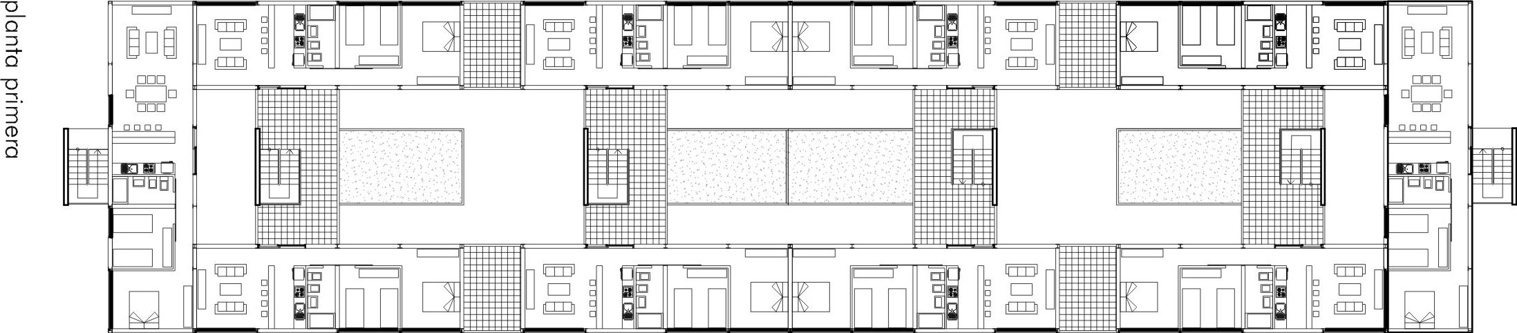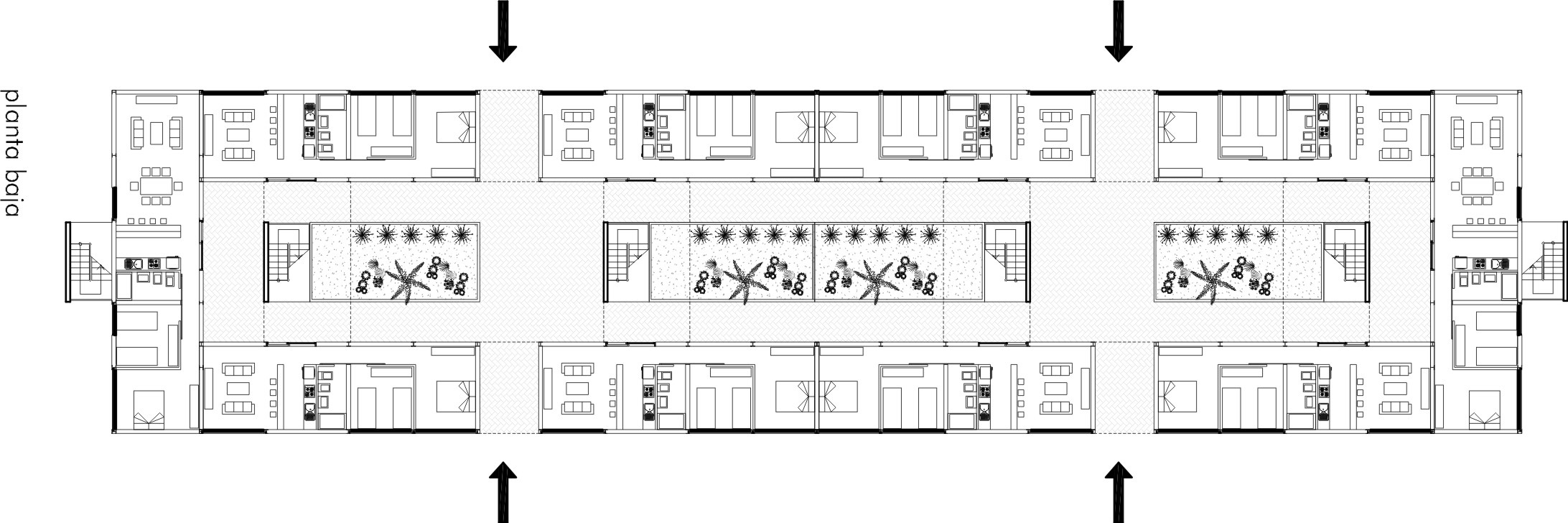 A modular residential complex project based on the repetition and combination of prefabricated modules that allow for the creation of different housing typologies. The organization around courtyards and intermediate spaces improves the bioclimatic performance of the complex and fosters community interaction, proposing a flexible, industrialized, and energy-efficient model of collective housing.