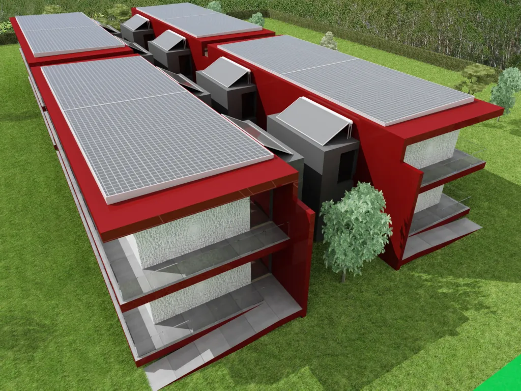Módulos educacionales desarrollados mediante arquitectura modular autosuficiente, diseñados para una rápida construcción, alta eficiencia energética y adaptación a diferentes entornos. El sistema permite ampliar o modificar los espacios educativos de forma flexible y sostenible.